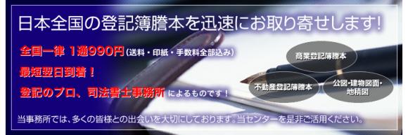 全国の登記簿謄本(不動産・会社法人)取得代行1通990円(法務局手数料・取得代行 手数料・送料込み)法務局からの直送なので最短翌日に到着します。クレジットカード 決済可 登記の専門家である司法書士事務所の運営なので安心です